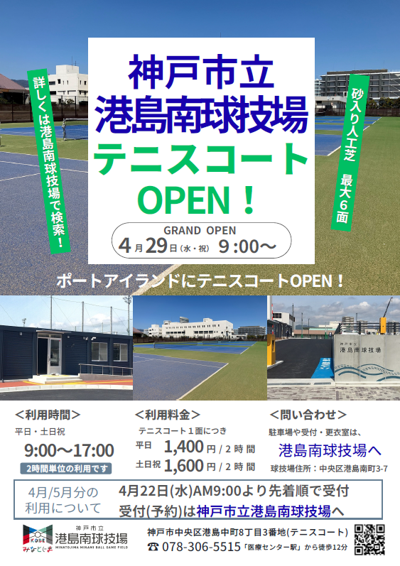この度、ポートアイランドにあります「神戸市立港島南球技場」に、新しくテニスコートがオープンします。