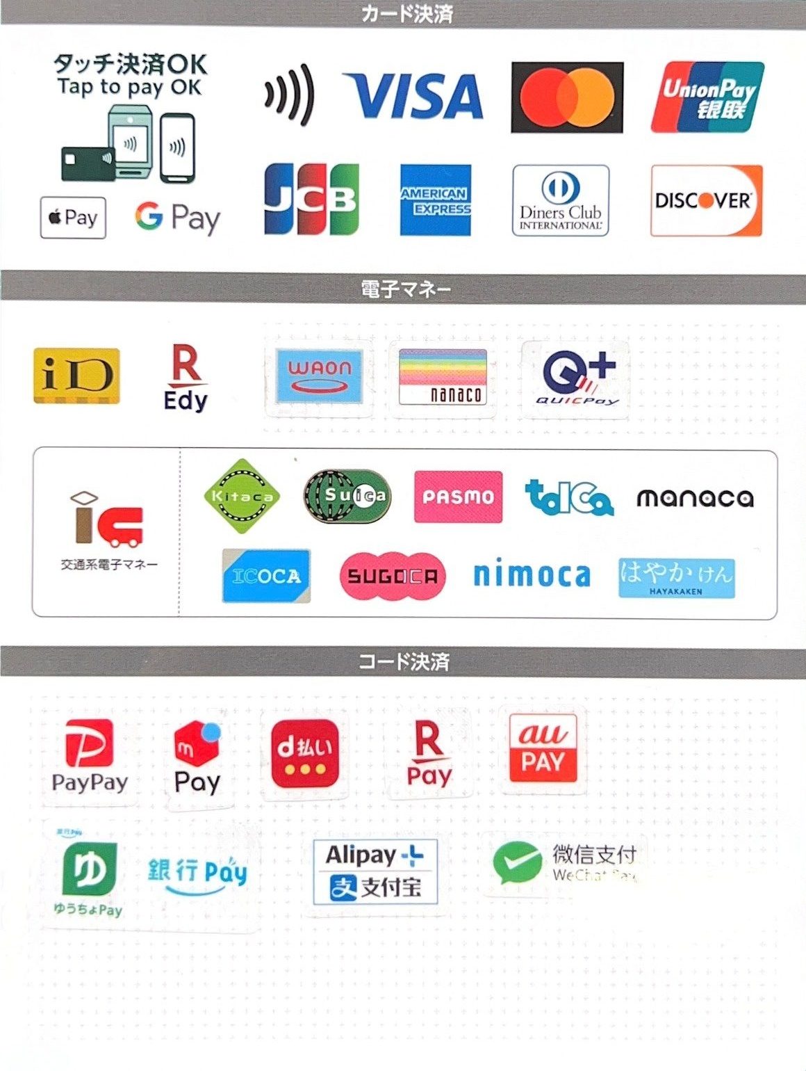 【キャッシュレス対応可能一覧】